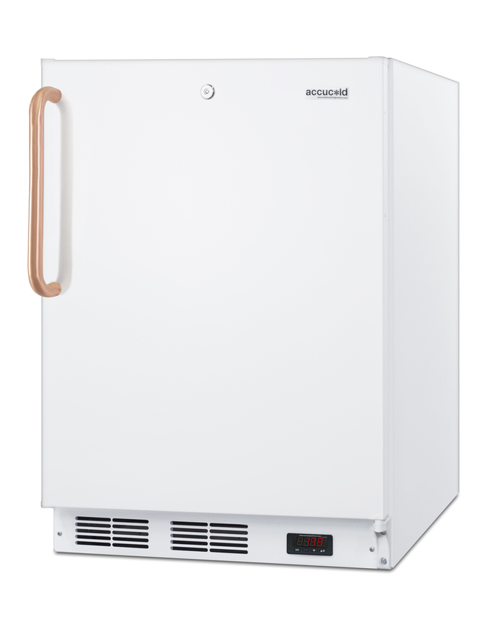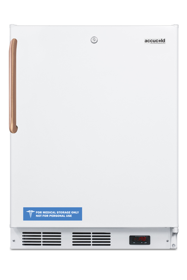 Accucold by Summit Appliance offers a quality line of refrigeration designed for healthcare applications, with pure copper handles that kill microbes. Sized at 32 in. high, the VT65MLBITBCADA is ideal for use under lower ADA compliant counters. It features a front-breathing design for built-in installation and a fully finished cabinet that also allows freestanding use. This unit runs at colder temperatures than standard freezers, with a static manual defrost cooling system that can reach -25ºC. The interior includes three slide-out basket drawers for convenient storage that keeps items cold when the door is opened. Additional features include an adjustable digital thermostat and one-piece interior liner for easier cleanup. The VT65MLBITBCADA includes a factory-installed towel bar style handle made from pure copper. Through its natural antimicrobial properties, copper will kill microbes, including viruses, in a shorter timeframe than most other metal surfaces allowing for a safer, cleaner user experience. This freezer is made in Europe and comes with a white exterior and right hand door swing. A factory-installed lock is located towards the top of the door for convenient security. For a matching refrigerator, see the FF7LWBITBCADA. NOTE: ALL VT65M FREEZERS ARE DESIGNED FOR MEDICAL/HEALTHCARE OR COMMERCIAL APPLICATIONS ONLY. THESE ARE NOT HOUSEHOLD FREEZERS.