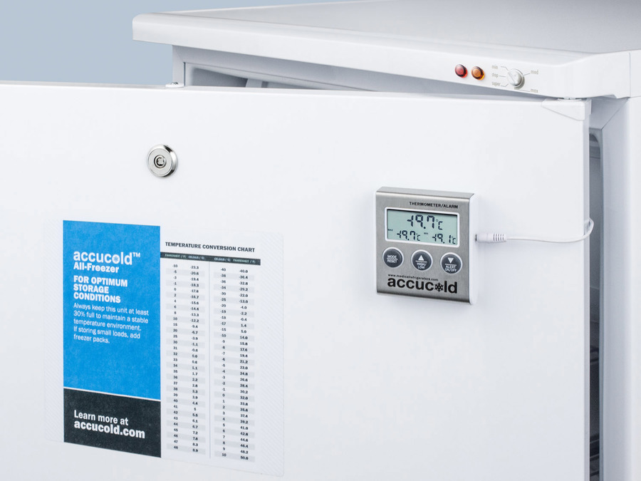 Accucold by Summit Appliance's MED series all-freezers come fully featured for stabilized temperature performance for use in medical, scientific, pharmaceutical, and laboratory institutions. The VT65MLMED has a 24" footprint designed for freestanding use. It comes in a white finish and includes a front-mounted lock for added security. The manual defrost VT65MLMED operates several degrees colder than most freezers for safe long-term storage of food, vaccines, or pharmaceuticals. Temperatures can reach and maintain -25º C. Three removable pull-out basket drawers provide convenient storage solutions, while extra thick insulation limits energy waste and keeps the cold inside. We include an audible NIST calibrated temperature alarm complete with an external display of the current and high/low temperature mounted on the door. A green dot hospital grade plug is installed for added safety in high traffic areas. An access port allows users to connect their own monitoring equipment. With its slim size and reliable construction, the VT65MLMED works well in any setting in need trusted storage. For a built-in version of this model, see the VT65MLBIMED. Additionally, we offer a variety of options to customize this unit, including USB data loggers, digital thermostats, self-closing doors, and more. NOTE: Accucold freezers are purpose-built to the support meeting the current CDC (Centers for Disease Control) guidelines for the storage of vaccines. As referenced in the current Vaccine Storage and Handling Toolkit, these units incorporate several key features for stable operation. For additional temperature assurance, the CDC recommends a calibrated digital data logger (DDL), which can be added with the factory-installed option DL2B or addition of the DL2BKit accessory. Select Accucold products have been tested and certified to the new NSF 456 standard, and are now available for purchase. For additional information, contact our products specialists.