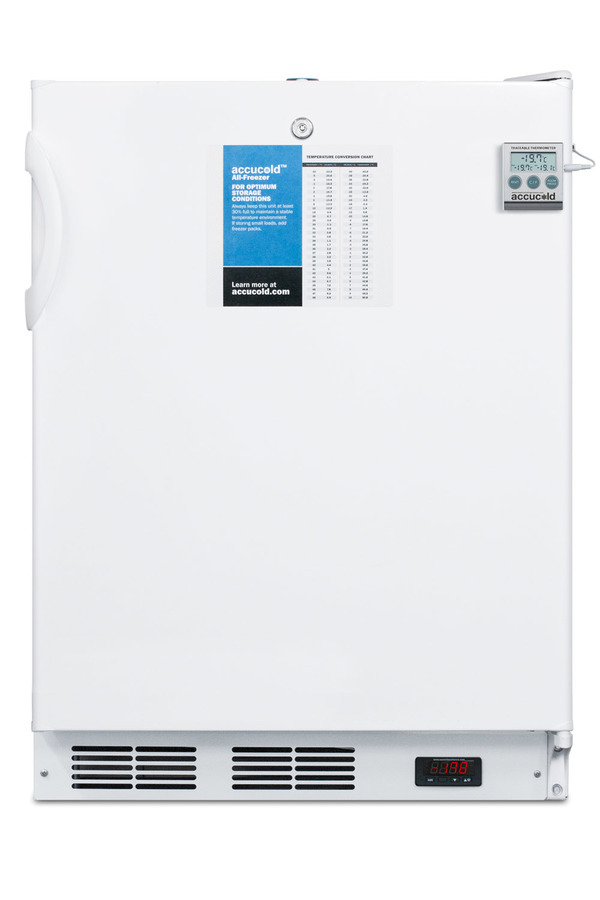 The VT65MLPLUS2ADA is a 24” wide all-freezer designed for freestanding use in ADA compliant settings, with a factory installed lock for added security and a digital thermostat for easy temperature management. This manual defrost unit can hold temperatures as low as -25ºC, ideal for many vaccines and laboratory items. The door includes a thermometer calibrated to NIST standards in our ISO/IEC 17025:2017 laboratory. It displays the current, minimum, and maximum temperature to the nearest tenth degree viewable in Celsius or Fahrenheit. The buffered temperature probe is stored in a glycol-filled bottle to ensure the temperature reading best reflects the temperature of other stored freezer contents. This model comes in a white finish and includes a hospital grade cord with a 'green dot' plug for added security in high traffic areas. The interior features three removable storage baskets with clear plastic fronts for easy storage that stays cold, even when the door is opened. This freezer can be paired with the auto defrost FF6LPLU2SADA for a complete matching set. For a built-in version of this model, see the VT65MLBIPLUS2ADA. Accucold's PLUS2 series freezers are intended for a wide variety of basic storage only. Storage of high-value vaccines, life science materials, medical, or clinical biologicals require a product with design features including, but not limited to tighter temperature controls, monitoring, and/or back-up.