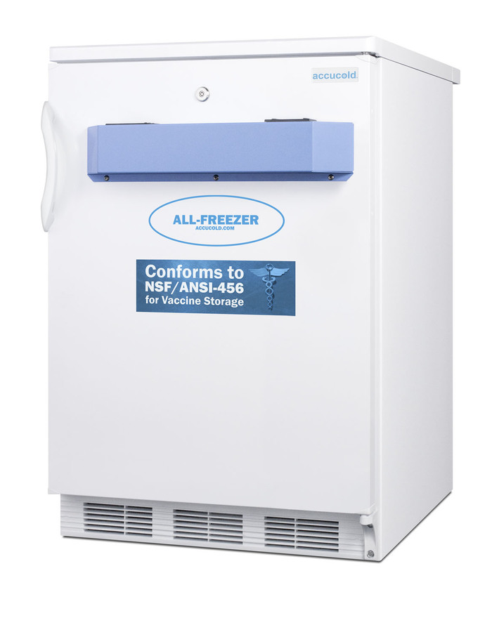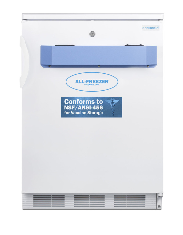 Accucold manufactures purpose-built freezers designed to meet the rigorous standards of NSF 456 for the stable storage of vaccines and other pharmaceuticals. The VT65MLVAC456 is a 24" wide all-freezer with a front-breathing design and fully finished exterior to allow built-in installation under counters or freestanding use. The digital microprocessor temperature controls are pre-set and locked at -30ºC to prevent accidental adjustments (if you need to adjust the temperature, contact our Technical Support team). As recommended by VFC programs and the CDC Vaccine Storage and Handling Toolkit, this unit includes a NIST calibrated thermometer that displays the current, minimum, and maximum temperatures to the nearest tenth of a degree with an external readout viewable in Celsius or Fahrenheit. A two-year certificate of calibration is included for your facility's records. The thermometer features an audible alarm to warn users if the interior has gone out of the programmed temperature range. The buffered temperature probe is encased in a glycol-filled bottle to best simulate the temperature of other stored contents, resulting in the utmost accuracy for temperature reporting. We include a pre-installed 3/8" probe hole for users who wish to install additional monitoring equipment. This freezer's temperature is pre-set and locked at -30ºC to prevent accidental temperature adjustments (if you need to change the temperature, contact our Technical Support team for assistance). The extra thick insulation and static manual defrost cooling system offer reliable temperature stability. The overall capacity is 3.2 cu.ft., with a 1.85 cu.ft. of usable space for vaccine storage. Three slide-out drawers on fixed shelves allow you to store contents easily. The drawers are made from clear plastic, allowing you to view contents while protecting them from warmer air when the door is opened. As required by the NSF/ANSI 456 standards, the interior includes a defrost indicator to alert users when it is necessary to defrost. The VT65MLVAC456 features a factory-installed lock located towards the top of the door for convenient access, with two keys included. It ships with a right hand door swing (for the door to open from the left, add upgrade LHD). The door is self-closing to help protect stored items. The hospital grade cord includes a green dot plug for a more secure connection in wall outlets. For this same unit sized to fit under lower ADA compliant counters, see the VT65MLBIVAC456ADA. *NOTE: This unit's thermostat is pre-set for Celsius. If you prefer Fahrenheit, add complimentary option DTMEDF or let your sales representative know upon order. ABOUT NSF 456: NSF/ANSI 456 is a voluntary standard introduced in 2021 that was designed to establish the performance and construction requirements for vaccine refrigeration. Models certified to this standard undergo strict testing to confirm temperatury consistency. All Accucold units approved to NSF 456 for vaccine storage are certified by an independent testing agency.