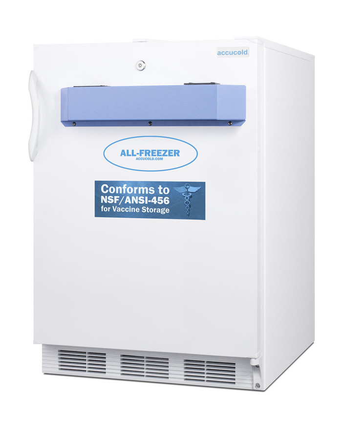 Accucold manufactures purpose-built freezers designed to meet the rigorous standards of NSF 456 for the stable storage of vaccines and other pharmaceuticals. The VT65MLVAC456ADA is a 24" wide 32" high all-freezer with a front-breathing design and fully finished exterior to allow built-in installation under lower ADA compliant counters or freestanding use. The digital microprocessor temperature controls are pre-set and locked at -30ºC to prevent accidental adjustments (if you need to adjust the temperature, contact our Technical Support team). As recommended by VFC programs and the CDC Vaccine Storage and Handling Toolkit, this unit includes a NIST calibrated thermometer that displays the current, minimum, and maximum temperatures to the nearest tenth of a degree with an external readout viewable in Celsius or Fahrenheit. A two-year certificate of calibration is included for your facility's records. The thermometer features an audible alarm to warn users if the interior has gone out of the programmed temperature range. The buffered temperature probe is encased in a glycol-filled bottle to best simulate the temperature of other stored contents, resulting in the utmost accuracy for temperature reporting. We include a pre-installed 3/8" probe hole for users who wish to install additional monitoring equipment. This freezer's temperature is pre-set and locked at -30ºC to prevent accidental temperature adjustments (if you need to change the temperature, contact our Technical Support team for assistance). The extra thick insulation and static manual defrost cooling system offer reliable temperature stability. The overall capacity is 3.2 cu.ft., with a 1.85 cu.ft. of usable space for vaccine storage. Three slide-out drawers on fixed shelves allow you to store contents easily. The drawers are made from clear plastic, allowing you to view contents while protecting them from warmer air when the door is opened. As required by the NSF/ANSI 456 standards, the interior includes a defrost indicator to alert users when it is necessary to defrost. The VT65MLVAC456ADA features a factory-installed lock located towards the top of the door for convenient access, with two keys included. It ships with a right hand door swing (for the door to open from the left, add upgrade LHD). The door is self-closing to help protect stored items. The hospital grade cord includes a green dot plug for a more secure connection in wall outlets. For this same unit sized to fit under lower ADA compliant counters, see the VT65MLBIVAC456ADA. *NOTE: This unit's thermostat is pre-set for Celsius. If you prefer Fahrenheit, add complimentary option DTMEDF or let your sales representative know upon order. ABOUT NSF 456: NSF/ANSI 456 is a voluntary standard introduced in 2021 that was designed to establish the performance and construction requirements for vaccine refrigeration. Models certified to this standard undergo strict testing to confirm temperatury consistency. All Accucold units approved to NSF 456 for vaccine storage are certified by an independent testing agency.